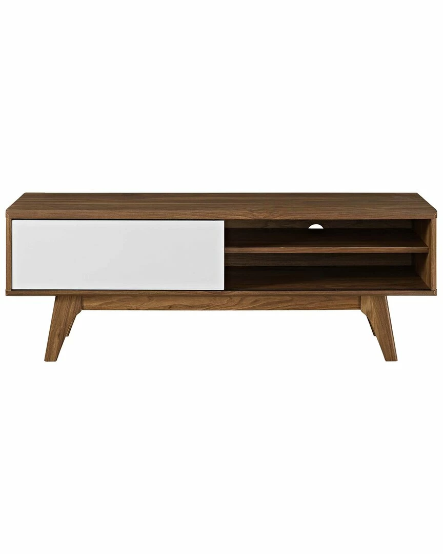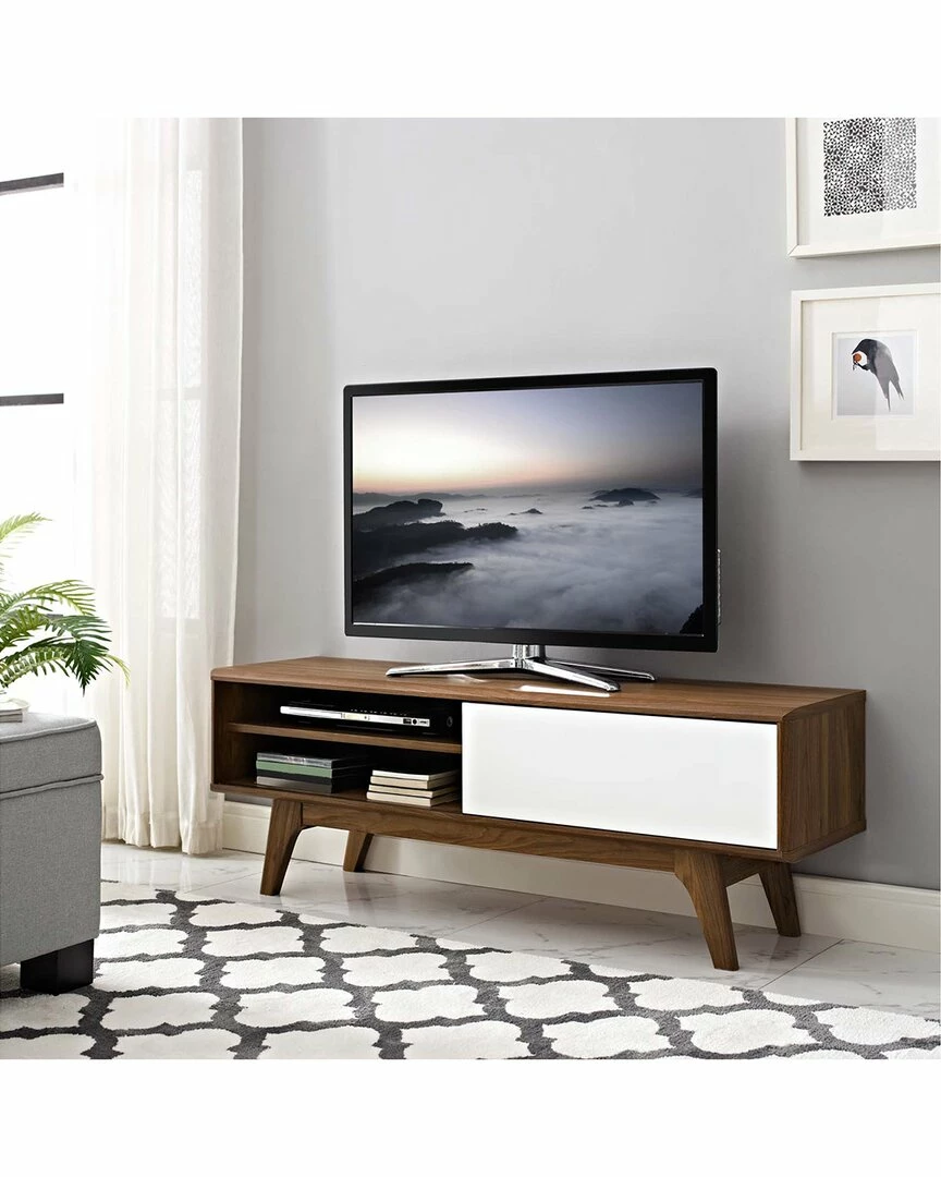 - Design details: Elevate your entertainment decor with the Envision 44 TV Stand. Featuring an elegant linear silhouette, Envision comes designed with a sliding white door for concealed and open storage space, height adjustable shelves on either side for your game system, DVD or Blu-ray player, and walnut grain veneer over durable fiberboard for reliable support. Supported by flared and tapered legs, update your living room decor while keeping your visual space clean with this versatile TV stand. Accommodates flat screen TVs up to 47 inches.