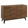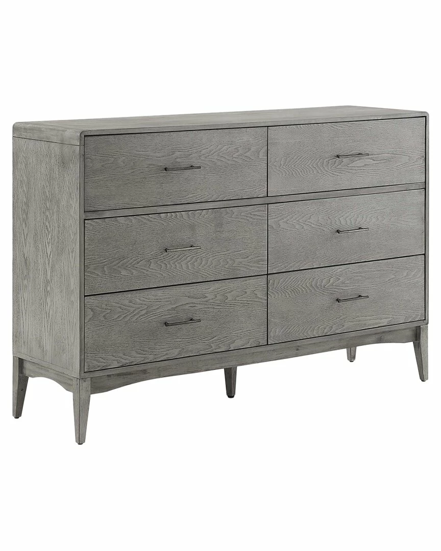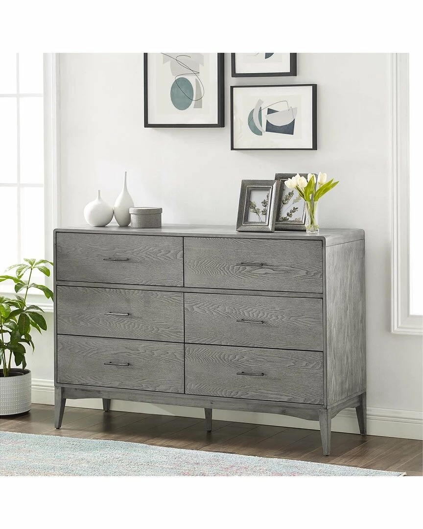 - Introduce the centerpiece of bedroom decor with the Georgia Wood 6-Drawer Dresser. With a streamlined silhouette, sleek hardware, and rounded corners, this dresser brings rustic charm and modern farmhouse style to a master bedroom, kid’s room, or guest suite. Resting on carved wood legs, this 6-drawer dresser is crafted with solid rubberwood with beautiful wood grain veneer that extends rich organic aesthetic to its surroundings. Perfect for keeping clothes, accessories, and more organized and concealed, this dresser offers ample storage space with its six spacious full-extension, easy-glide drawers. Create a cohesive look with the Georgia Bedroom Furniture Collection. Assembly required.Set Includes:One – Georgia Dresser