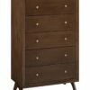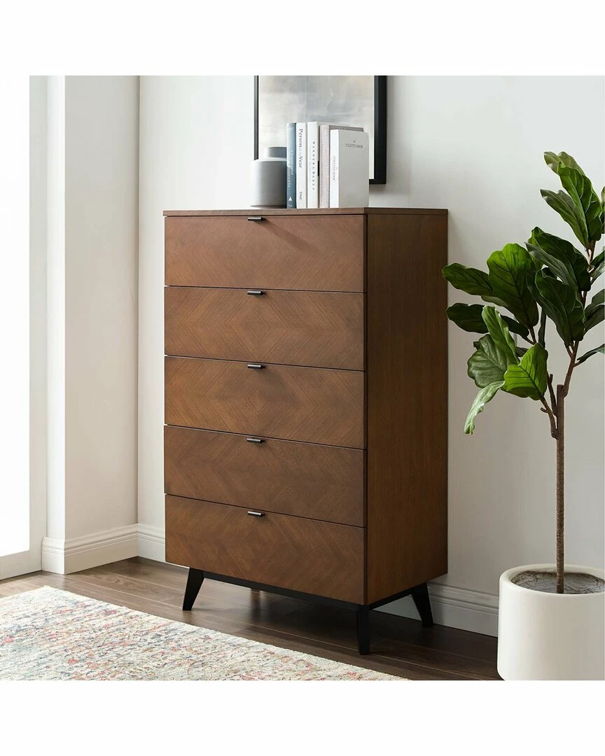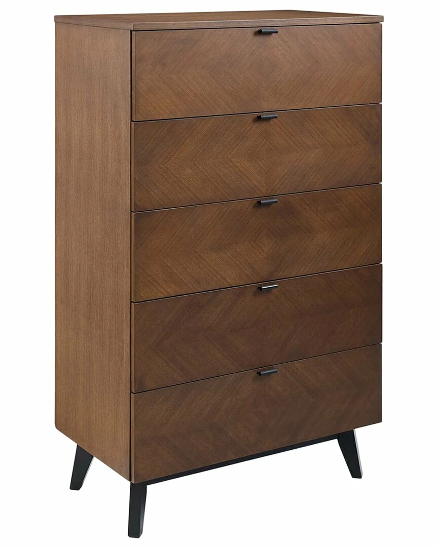 - Redirect your bedroom decor with the edgy mid-century modern style of the Kali Wood Chest. The Kali Chest showcases beautifully grained brown ash wood veneer with a geometric chevron pattern and five soft-close easy-glide storage drawers. Solidly constructed from wood and MDF particleboard, the Kali Chest rests atop splayed black legs and non-marking foot caps while updating your master suite or guest room with a commanding presence. Claim center stage in your bedroom and organize with Kali Wood Chest. Assembly required.Set Includes:One – Kali Wood Chest