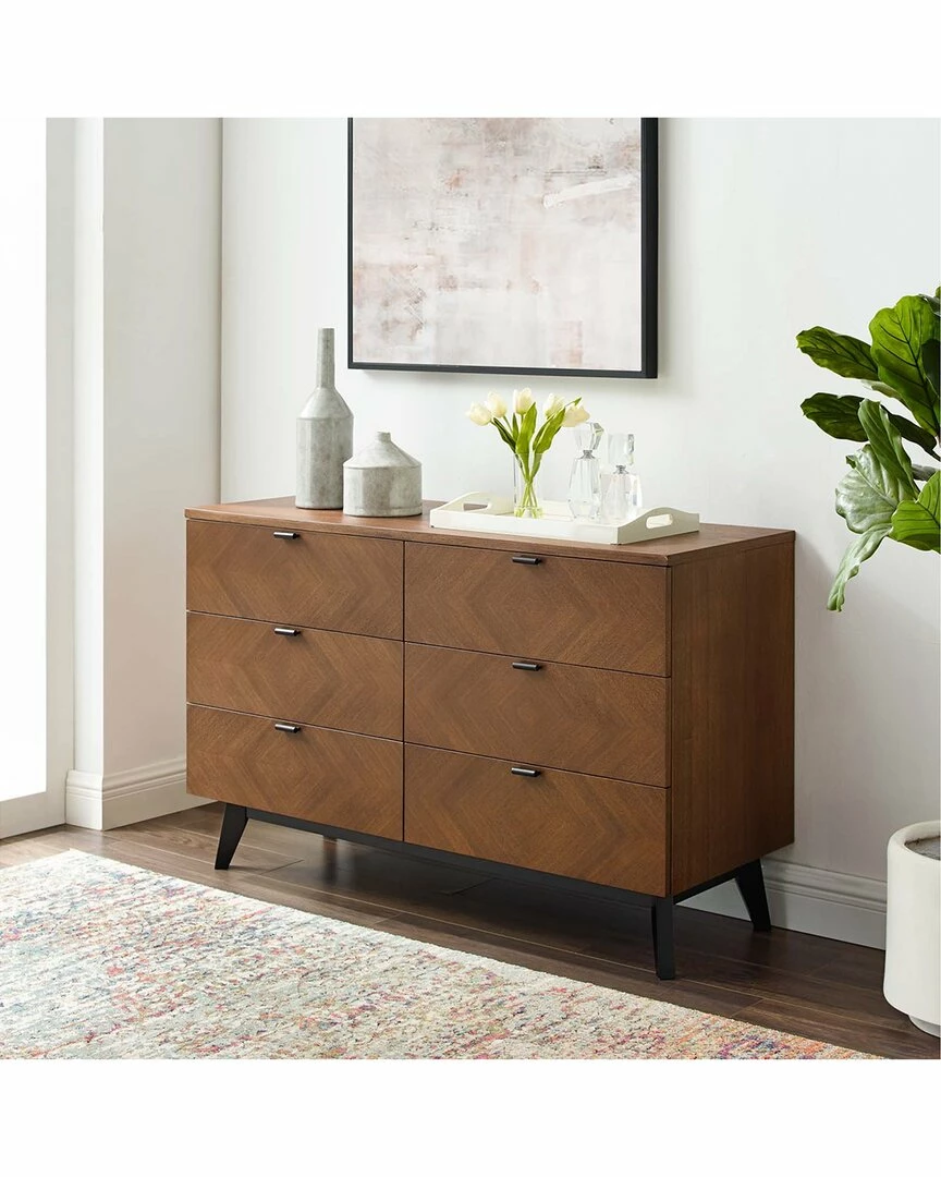 - Redirect your bedroom decor with the edgy mid-century modern style of the Kali Wood Dresser. The Kali Dresser showcases beautifully grained brown ash wood veneer with a geometric chevron pattern and six soft-close easy-glide storage drawers. Solidly constructed from wood and MDF particleboard, the Kali Dresser rests atop splayed black legs and non-marking foot caps while updating your master suite or guest room with a commanding presence. Claim center stage in your bedroom and organize with Kali Wood Dresser. Assembly required.Set Includes:One – Kali Wood Dresser