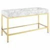 - Channel opulence with the glam deco Kingsley Matte Black Stainless Steel Artificial Marble Bathroom Vanity. The Kingsley Bathroom Vanity introduces a royal style to your bathroom with the dual artificial marble curved basins and matte black metal accents. Resting on a black stainless steel frame, the Kingsley 8-Inch Centerset Bathroom Vanity features a modern glass shelf for storing all your bathroom essentials and rests on non-marking foot caps to protect flooring. Assembly required, fixtures not included.