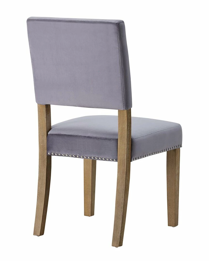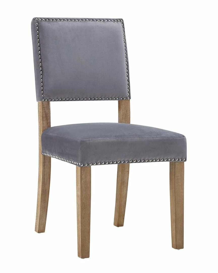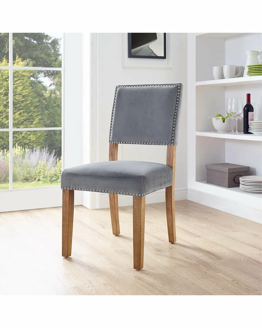 - Design details: Update your decor with the Oblige Dining Side Chair. Boasting soft velvet polyester upholstery, fine nailhead trim, no sag spring support, comfortable padded cushion, and solid natural wood frame, Oblige is a chair overflowing in both quality and design. Complete with non-marketing foot caps, introduce a refreshing modern farmhouse look with this solidly made dining chair. Nailhead Trim Color: Ivory – Antique Copper, Other Colors – Polished Silver Accent.