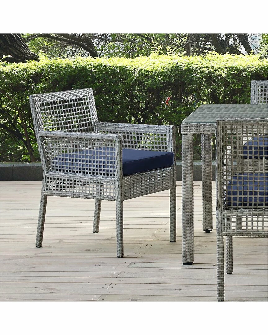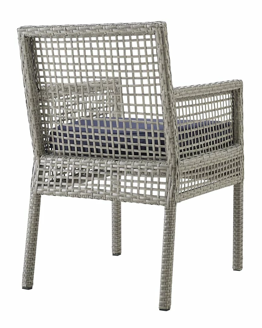 - Design details: Weave conversational threads into a rollicking good time with Aura Outdoor Patio Dining Chair. Aura comes with a synthetic gray-on-navy tone wicker rattan weave and a powder-coated aluminum frame that delivers a softly versatile outdoor collection that shifts to meet the needs of the moment. Outfitted with a machine washable and fade resistant all-weather fabric cushion, Aura will make your outdoor spot the focal point of good memories and festive gatherings while enhancing your patio, backyard or poolside arena. Complete with non-marking foot caps, enjoy spacious seating and enhanced comfort with this reliable piece of outdoor furniture.