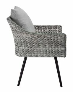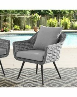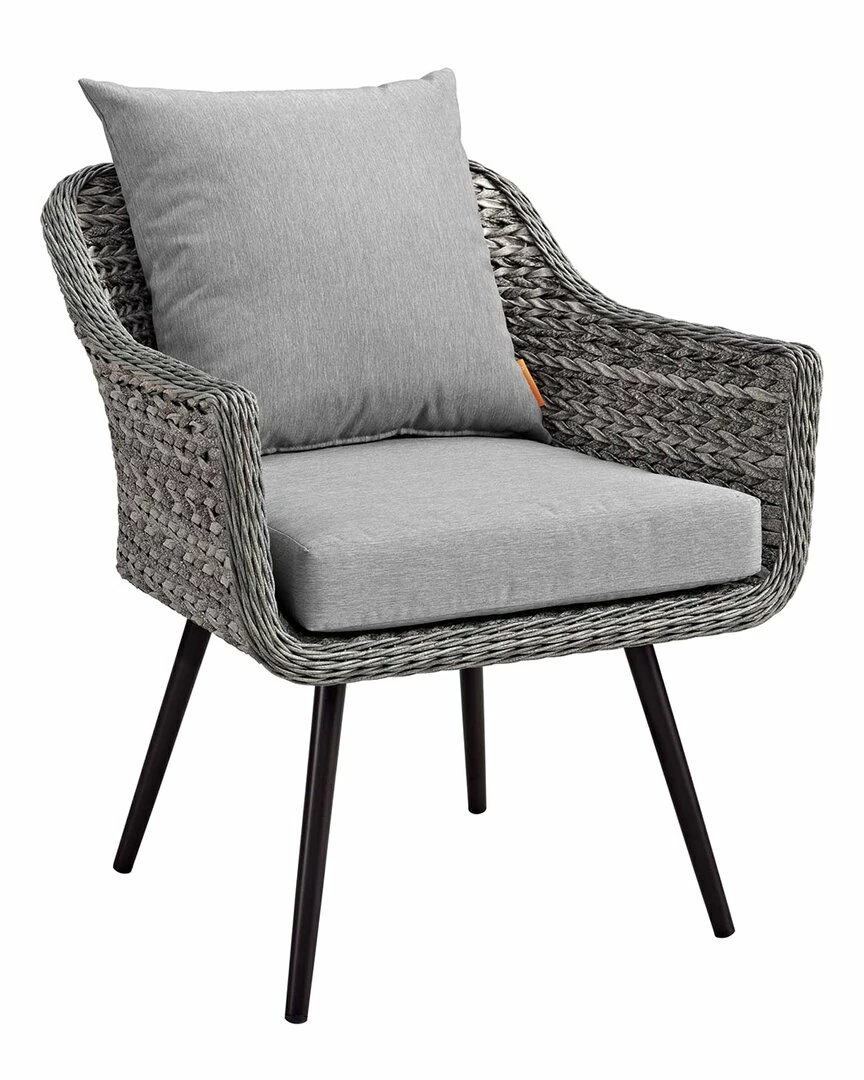 - Gather family and friends to indulge in good weather and a premium lounge experience with the Endeavor Outdoor Patio Collection. Sporting a stylish contemporary modern look, Endeavor Patio Arm Chair features waterproof, black powder-coated aluminum legs and non-marking foot caps. A designer gray-on-gray tone synthetic rattan weave perfect for upgrading a variety of balcony, garden, backyard, and patio decors make Endeavor Outdoor Arm Chair a vital outdoor decor piece. The spacious profile of this wicker rattan arm chair and all-weather cushions offer long-lasting comfort when relaxing or entertaining.