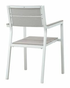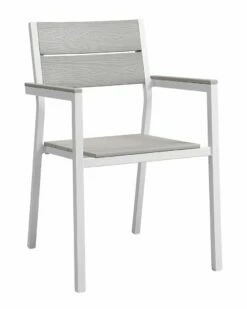 - Bordered by the Atlantic Ocean rests the Maine Outdoor Patio Dining Arm Chair. Distinguished by its synthetic wood grain plank boards, powder-coated aluminum frame, inspired design, and rich organic feel, Maine Patio Dining Arm Chair stands out as a versatile piece for outdoor dining. This contemporary modern outdoor chair is perfect for contemporary patios, backyards, poolside, and other outdoor lounge areas.