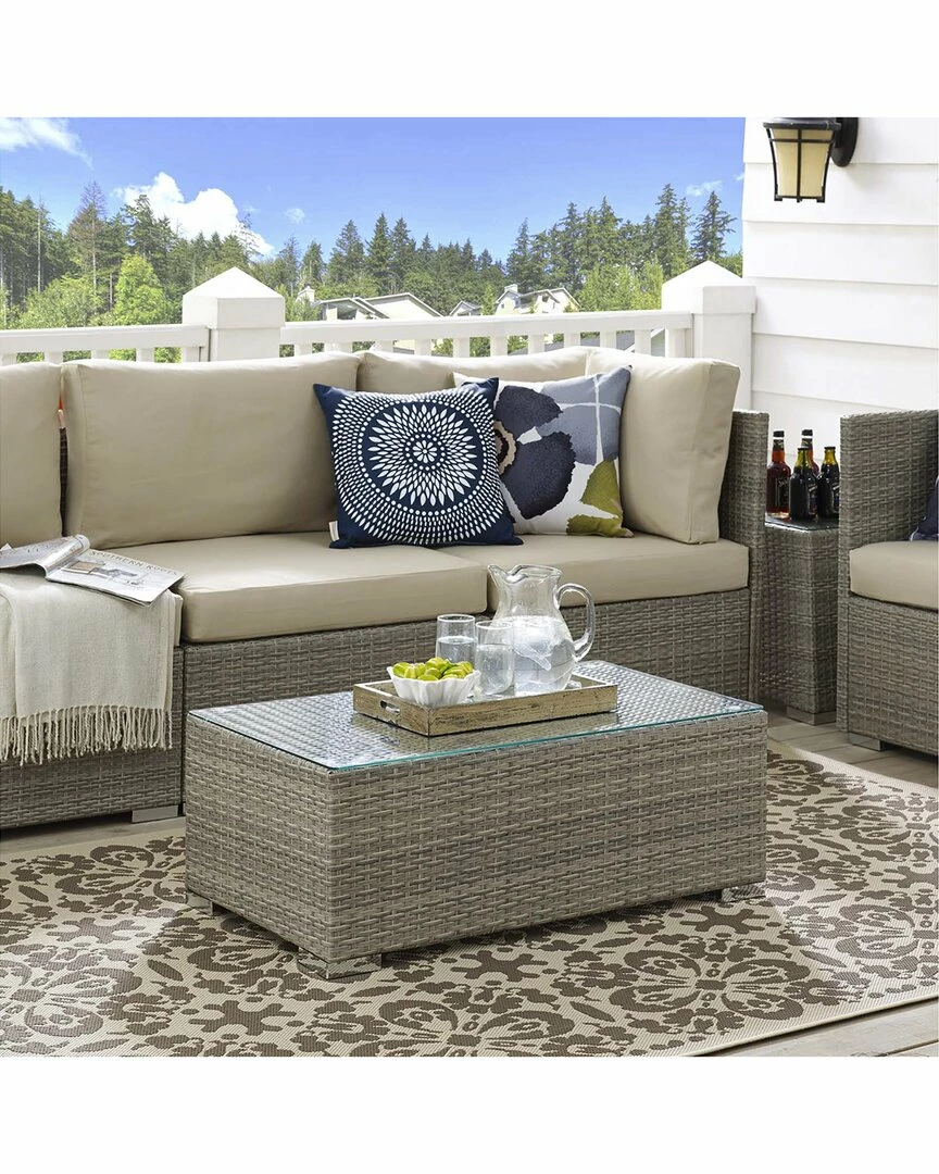 - Design details: Enjoy the outdoors while benefiting from style and comfort. Repose offers a detailed tan and gray synthetic rattan weave with UV protection for eye-catching appeal and durability, tempered glass top, non-marking foot pads, and a sturdy powder-coated aluminum frame and base. Subtle style defines the Repose outdoor sectional collection making it a natural choice for enhancing your patio, backyard, or poolside gatherings. This installment of the series is a coffee table.