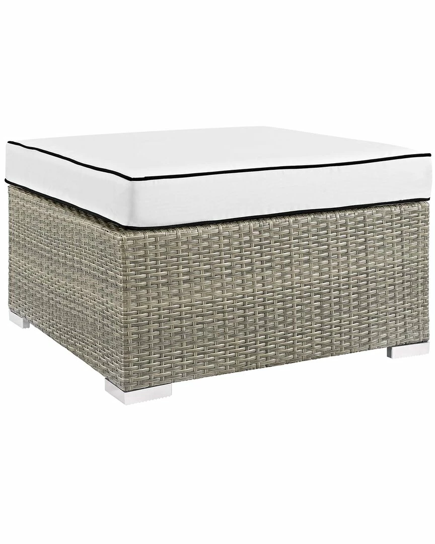 - Design details: Enjoy the outdoors while benefiting from style and comfort. Repose offers a detailed tan and gray synthetic rattan weave with UV protection for eye-catching appeal and durability, plush 4 thick all-weather polyester cushion with contrasting color French piping, non-marking foot pads, and a sturdy powder-coated aluminum frame that supports up to 331 pounds. Subtle style defines the Repose outdoor sectional collection making it a natural choice for enhancing your patio, backyard, or poolside gatherings. This versatile ottoman can be used either as a footrest or as an additional seating surface.
