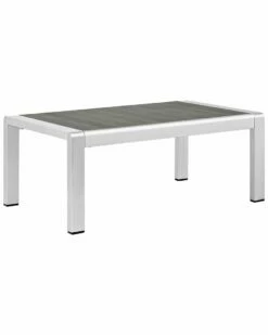 - Enjoy your patio or backyard leisure time with the strong and durable Shore Outdoor Aluminum Coffee Table. Made with an anodized brushed aluminum frame and non-marking black plastic foot caps, Shore Patio Coffee Table features tone-on-tone grays with wood accents on the paneling for a chic and minimalist look. The Shore Outdoor Patio Coffee Table complements your casual gatherings with a look and functionality you can rely on.