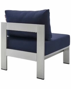 - Enjoy your patio or backyard leisure time with the strong and durable Shore Outdoor Aluminum Armless Chair. Made with an anodized brushed aluminum frame and non-marking black plastic foot caps, Shore comes outfitted with resilient Sunbrella fabric canvas cushions tested to last through all weather conditions. The Shore Outdoor Aluminum Armless Chair complements your casual gatherings with a look and functionality you can rely on.