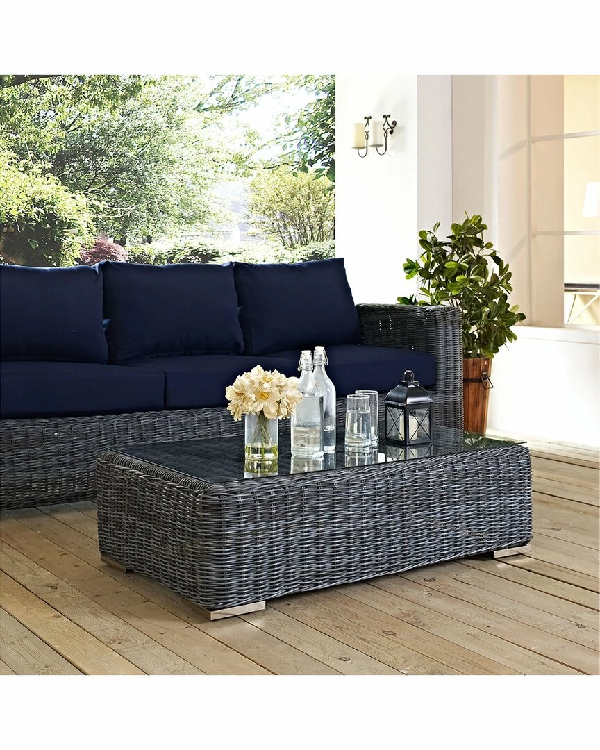 - Design details: Experience the outdoors with exceptional comfort and quality. Summon offers an exquisite two-tone synthetic rattan weave, plush all-weather cushions with industry-leading Sunbrella fabric, UV protection, and a sturdy powder-coated aluminum frame. Featuring rounded arms and an elegant modern look, Summon is an avant-garde outdoor sectional series well-equipped for enhancing patio, backyard, or poolside gatherings. This installment of the series is an Outdoor Patio Coffee Table.