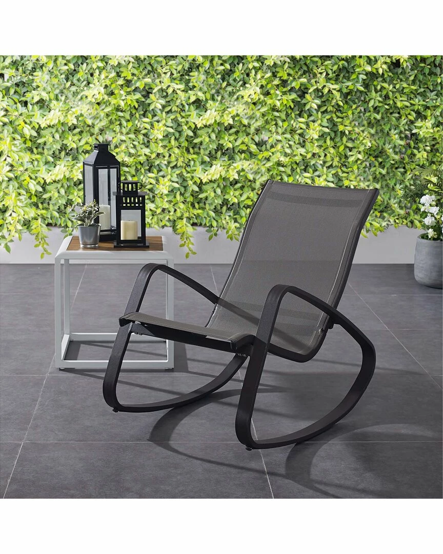 - A contemporary update to outdoor lounging, Traveler Rocking Mesh Sling Lounge Chair comes with an ergonomic all-weather Textilene mesh sling seat and long-lasting powder-coated aluminum frame. Traveler Rocking Lounge Chair features sleek rounded armrests, plastic foot caps to help protect hardwood patio flooring, and a fresh, modern aesthetic, that complete the look of this stylish outdoor lounge chair. Enjoy calm, rocking movement while relaxing next to the pool, garden, patio, or deck. Chair Weight Capacity: 331 lbs.