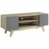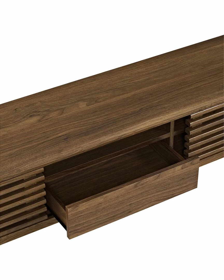 - Design details: Tap into mid-century aesthetics with the Render 59 TV Stand. Render features a durable particleboard frame with smooth walnut grain veneer, four tapered wood legs, full-extension center drawer with shelf on top, non-marking foam foot pads, and opposite side adjustable shelves with dual slatted sliding doors for sophisticated media storage. Complete with cable management holes on both sides, Renders contemporary linear style is the perfect addition to the modern living room, lounge or recreation area.
