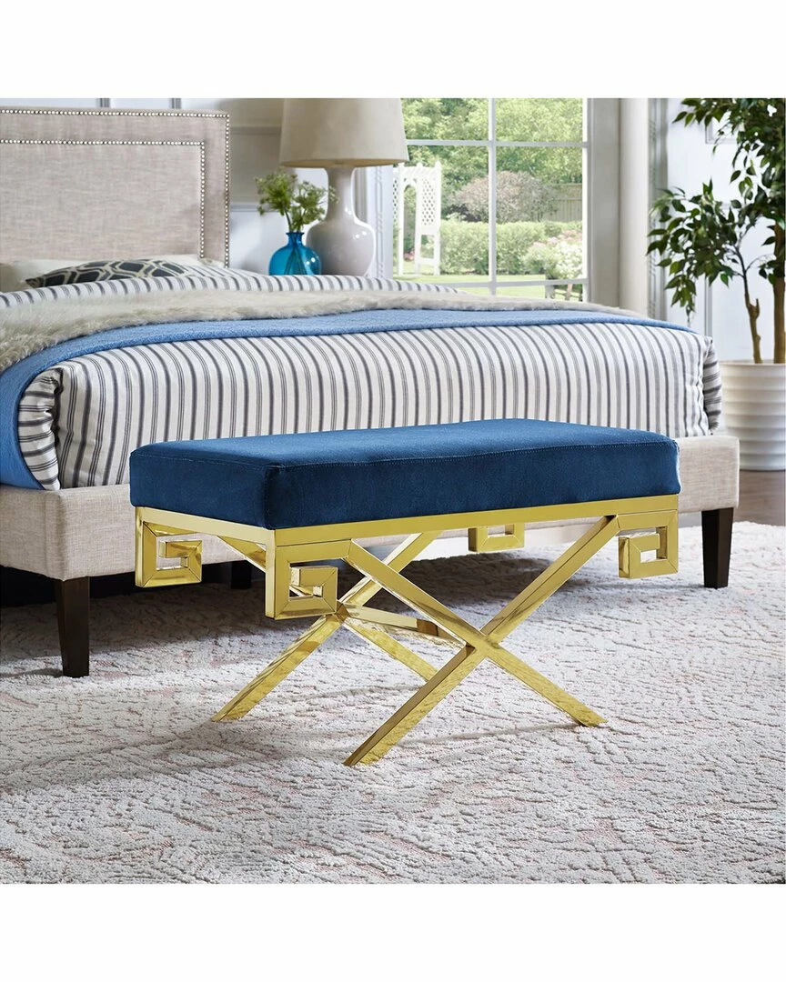 - Design details: Embrace modern whimsy with Rove. Brimming with energy and a sleek modern look, Rove features a polished gold stainless steel base with a Greek Key design, dense foam padding, and a soft stain-resistant velvet polyester upholstered top. A striking statement piece in the living room, bedroom or lounge area, Rove can support up to 331 pounds and comes with foot pads to help protect your flooring.