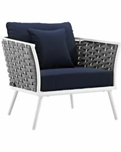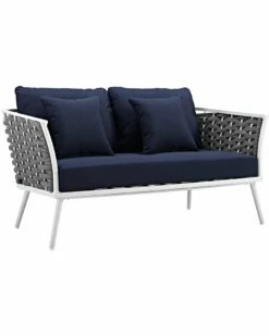 - Gather family and friends for pleasant weather and good conversation with the Stance Outdoor Collection. Boasting a contemporary modern look, Stance features woven polyester fabric rope seat back and flared powder-coated aluminum frame, and waterproof all-weather fabric cushions with plush 5″ thick, dense foam padding provide a relaxing spot to lounge. A versatile set designed for long-lasting durability, each piece in the Stance Collection can be mixed and matched and effortlessly arranged to fit the spontaneous needs of you and your guests. Cushion Thickness: 5″H. Chair Weight Capacity: 331 lbs. / Sofa Weight Capacity: 551 lbs.