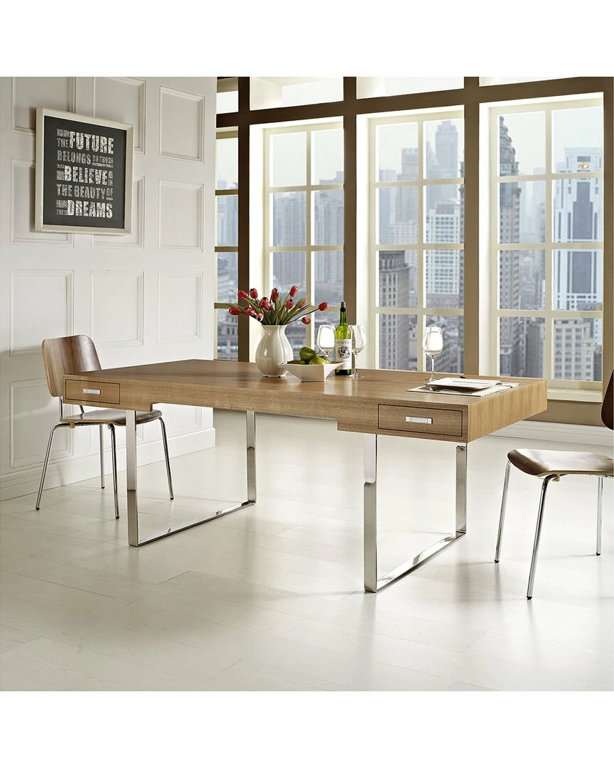 - Begin your creative endeavors with moments of clarity. The Tinker Desk was designed to limit distractions while keeping your sights focused on those most visionary pursuits. The construction blends a delicate interplay between steel and wood as two storage drawers drift away to the periphery, creating room for the steel base underneath. While the dovetailed drawers are perfect for your pens and papers, Tinker reminds us that it is the subtle advancements above the surface that make all the difference. From Tinker’s meticulously crafted construction to the boundless creativity waiting to be performed on it, embark on ingenuity by taking a few small steps in the right direction.Set Includes:One – Tinker Plywood Desk